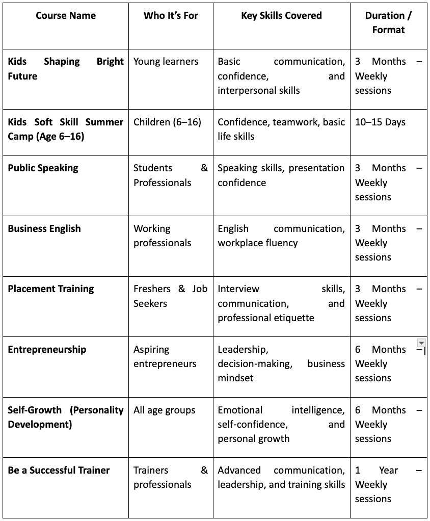 These training institutes provide training programs for students, freshers, and working professionals. To make it easily accessible, you can look for Soft Skills Classes Near Me. Training programs such as Soft Skills Training for Students and Soft Skills Training for Freshers aim to enhance confidence, communication, and professional etiquette to face the challenges of the corporate world from the very first day.